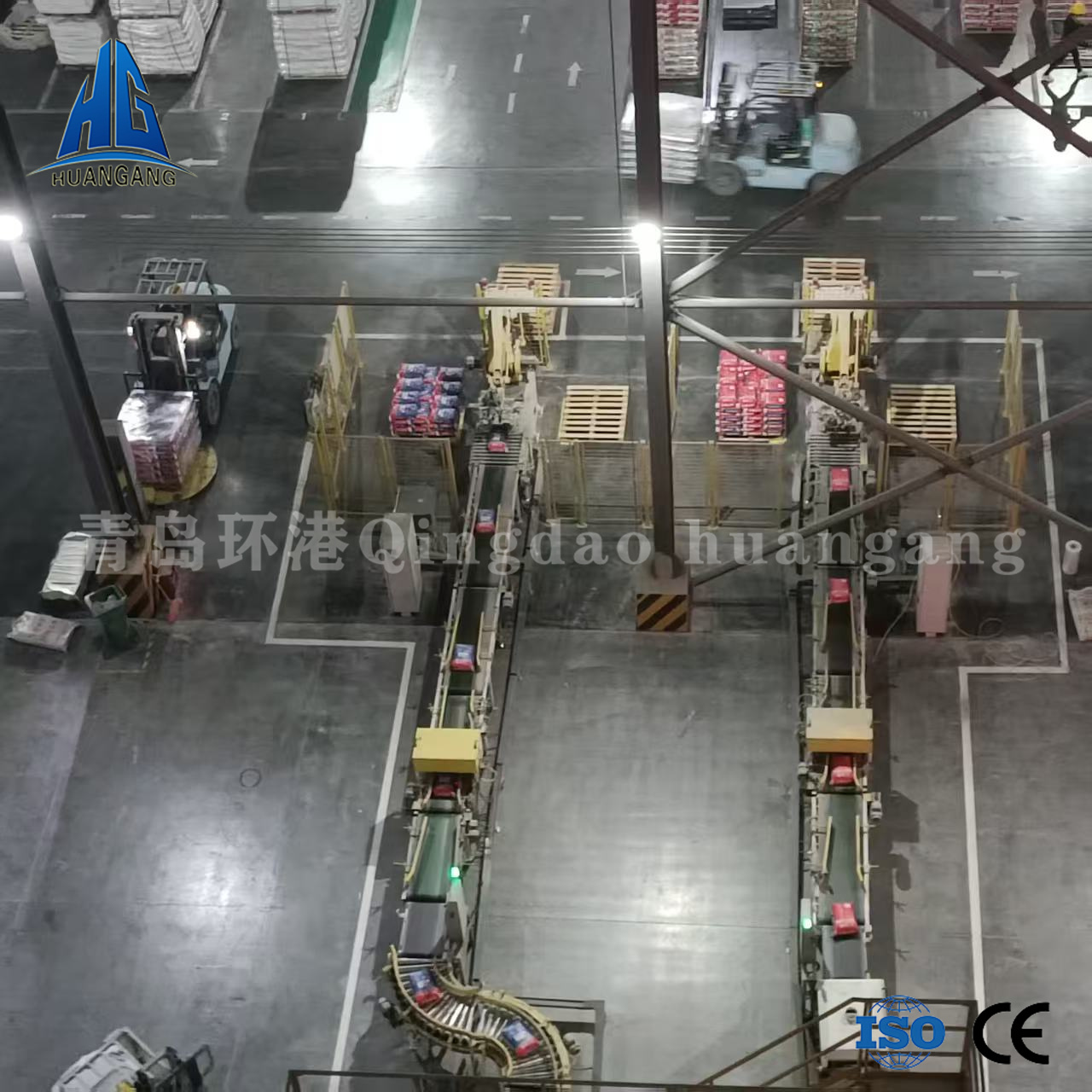 本設備一般由機械臂、機械抓手、碼垛皮帶機、清灰機、拐彎機、控制系統、末端執行器(如吸盤或夾爪)等部分組成。當機械手到達貨物抓取位置時,末端執行器(如吸盤通過產生真空吸附力,或夾爪通過夾緊動作)會抓取貨物。之后,機械手將貨物移動到指定的碼垛位置,按照預先設定的碼垛模式(如交錯式、行列式等)將貨物逐一堆放。在整個過程中,傳感器會實時監測機械臂的位置、貨物的抓取狀態等信息,以確保碼垛過程的準確和安全。