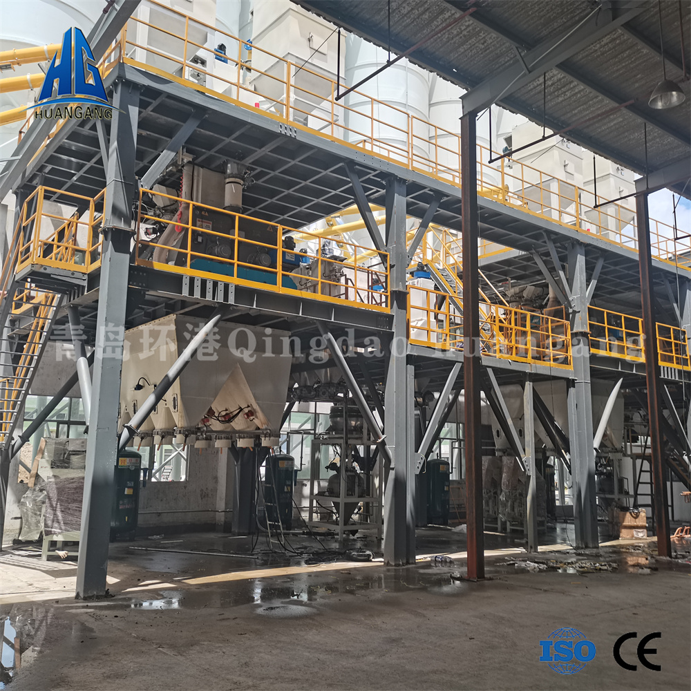 青島環港結合國內外技術和經驗積累,推出新型全自動節能干混砂漿成套設備。該設備可配合干式制砂系統或者濕砂烘干系統,生產出優質高標準的干粉砂漿和特種砂漿。主樓采用塔式結構,將粉料倉安裝在主樓頂部,外加劑系統采用獨立平臺計量泵送。骨料自上而下經過計量層、混合機層、成品倉、控制室、散裝機、包裝機。